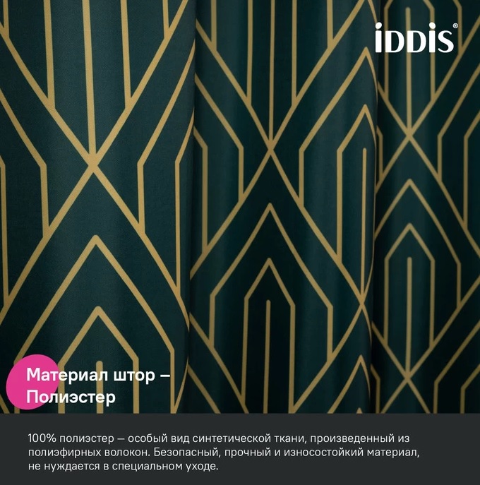 Текстильная штора красивого изумрудно-зеленого цвета с крупным геометричным золотым узором в стиле ар-деко создаст утонченное элегантное настроение даже в самом простом интерьере.