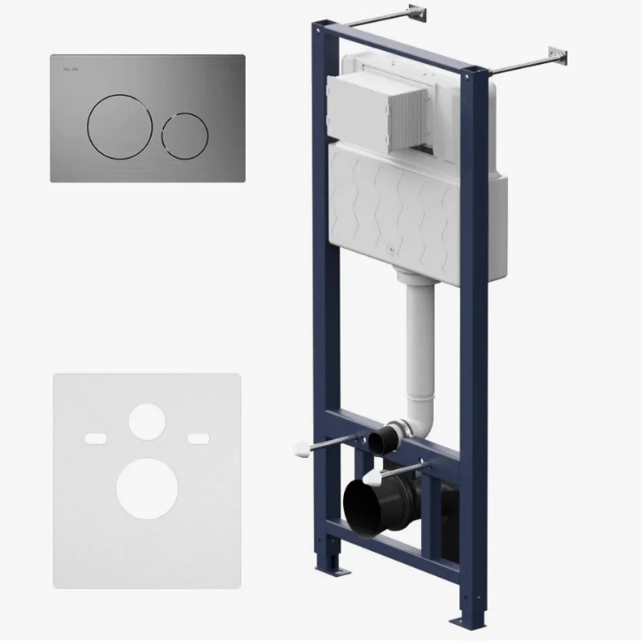 Оснащение: крепления, смывной бачок, кнопка смыва, звукоизолирующая прокладка
