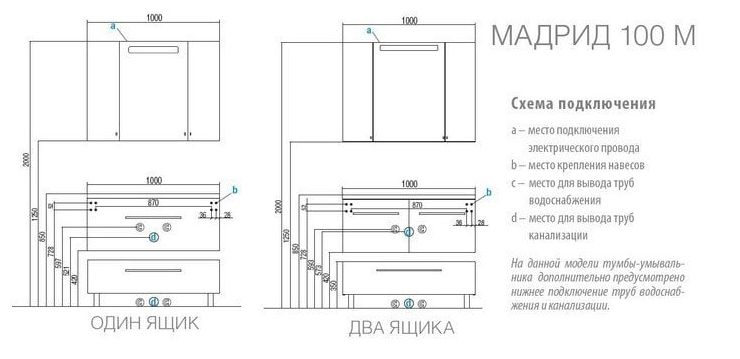 Для данной модели тумбы дополнительно предусмотрено нижнее подключение труб водоснабжения и канализации!
