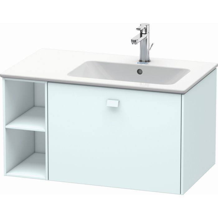 Купить Тумба под раковину Duravit Brioso, 82х47,9х44,2 см, подвесная, 1 выдвижной ящик, с открытой полкой справа, ДСП, цвет: светло-голубой, шкафчик навесной, механизм доводчика, прямоугольная, правая, в ванную комнату, правосторонняя, умывальник, рукомойник, мебельная, размеры, комплект, сантехника, классическая, коллекция, тумбочка, влагостойкая (ДЮРАВИТ) в магазине Сантехмастер недорого