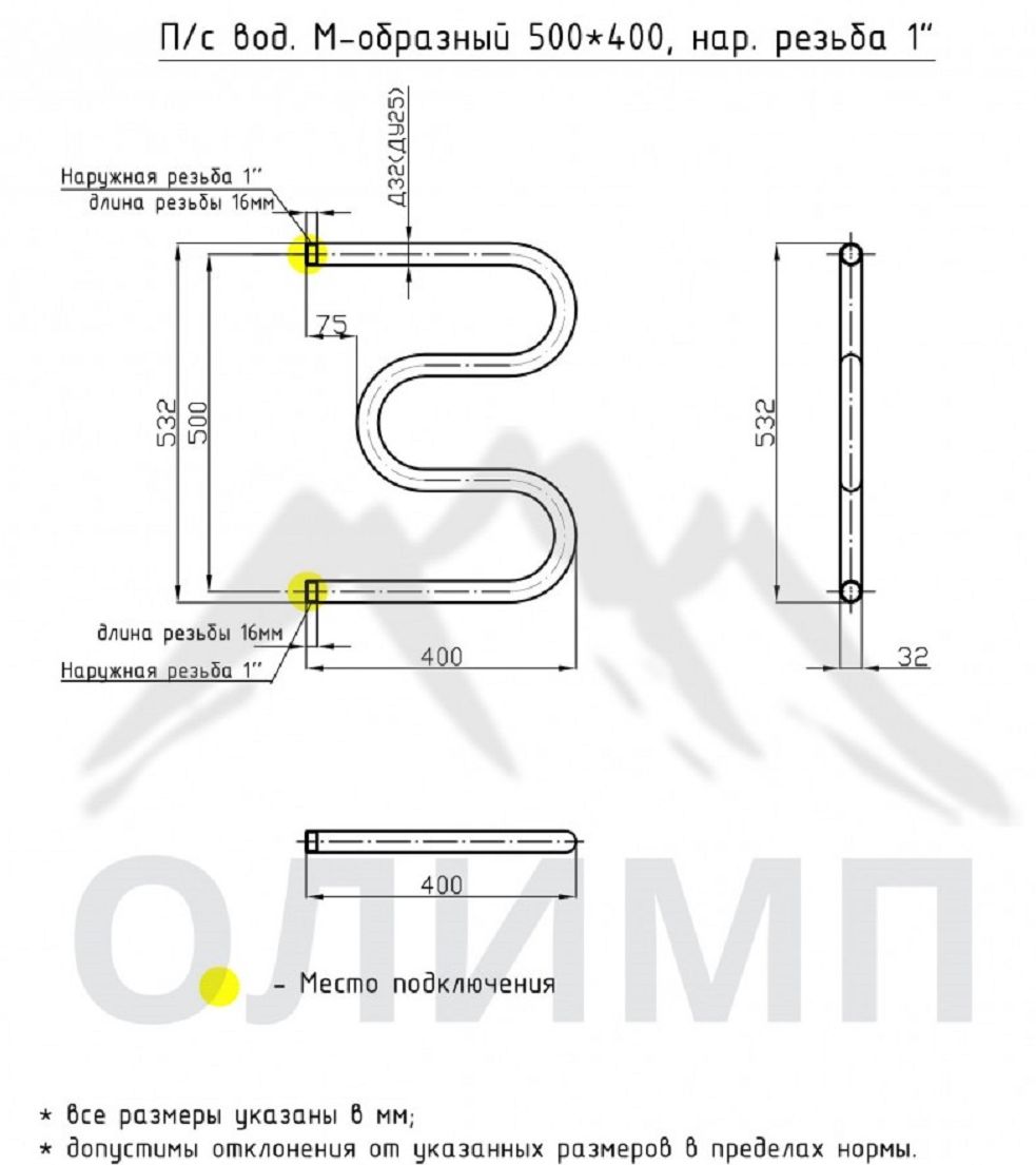 Купить Полотенцесушитель 500х400 мм Олимп М-образный, 1" дюйм, водяной. боковое подключение, из нержавеющей стали, форма м-образный, настенный, цвет хром, для ванны, горизонтальный, к стояку горячей воды, отопления, межосевое расстояние, хромированный, нерж, нержавейка, шириной, теплоотдача, крепление, диаметр, сантехника, размеры, змеевик в магазине Сантехмастер недорого.