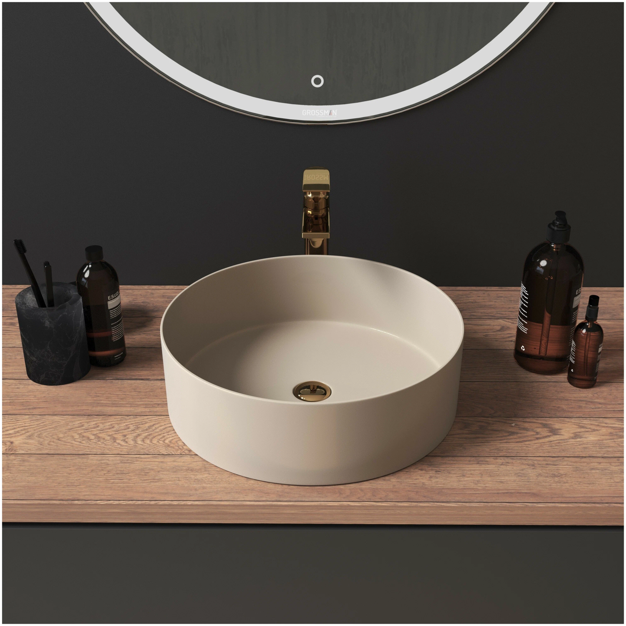 Купить Раковина GROSSMAN GR-3013BEM, 40х40х12 см, фаянс, накладная, чаша, мебельная, круглая, цвет бежевый матовый, без отверстия под смеситель, без слива-перелива, умывальник, рукомойник, классическая/стандартная, универсальная, в ванну/ванную, керамическая/ фаянсовая, мебельная, фаянс, керамика, размеры, диаметр (ГРОССМАН) в магазине Сантехмастер недорого