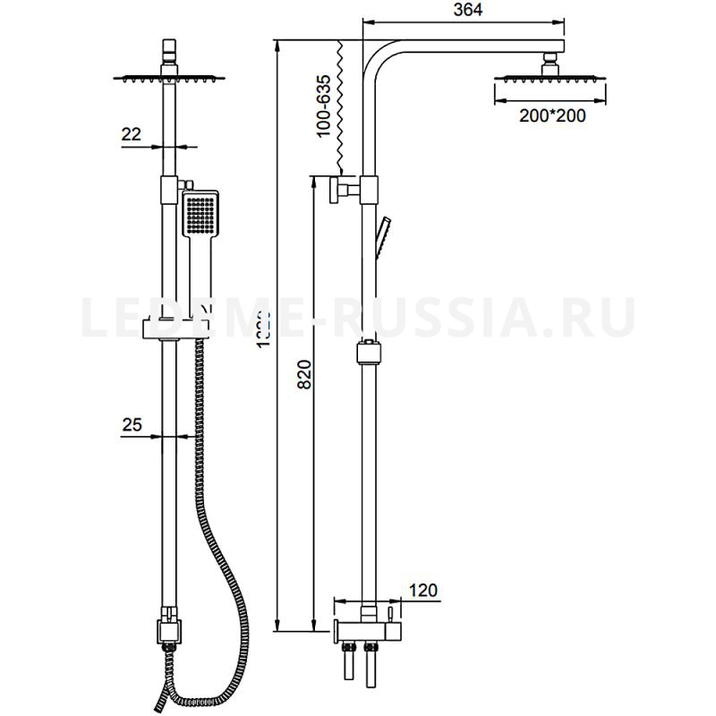 Купить Душевой гарнитур настенный LEDEME, 820/1320 мм, цвет хром, комплект: тропический душ (с верхней лейкой)/лейка/стойка/шланг, латунь, вертикального монтажа, настенный, латунный, в квартиру, частный дом, дачу, сантехника, размер (Ледеме) в магазине Сантехмастер недорого,