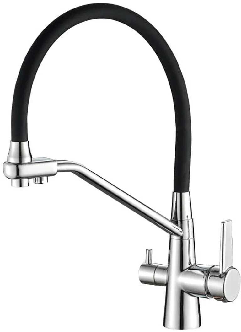 Купить Смеситель для кухни/мойки Aquanika Comfort, с подключением к фильтру для питьевой воды, однорычажный, керамический картридж, поворотный/гибкий излив, высокий, длина излива 250 мм, латунь, цвет хром/черный, кухонный, хромированный, вертикальный, кран, комплект, сантехника, водопроводные, размер, характеристики, высота, расстояние, длина (Росинка) в магазине Сантехмастер недорого,