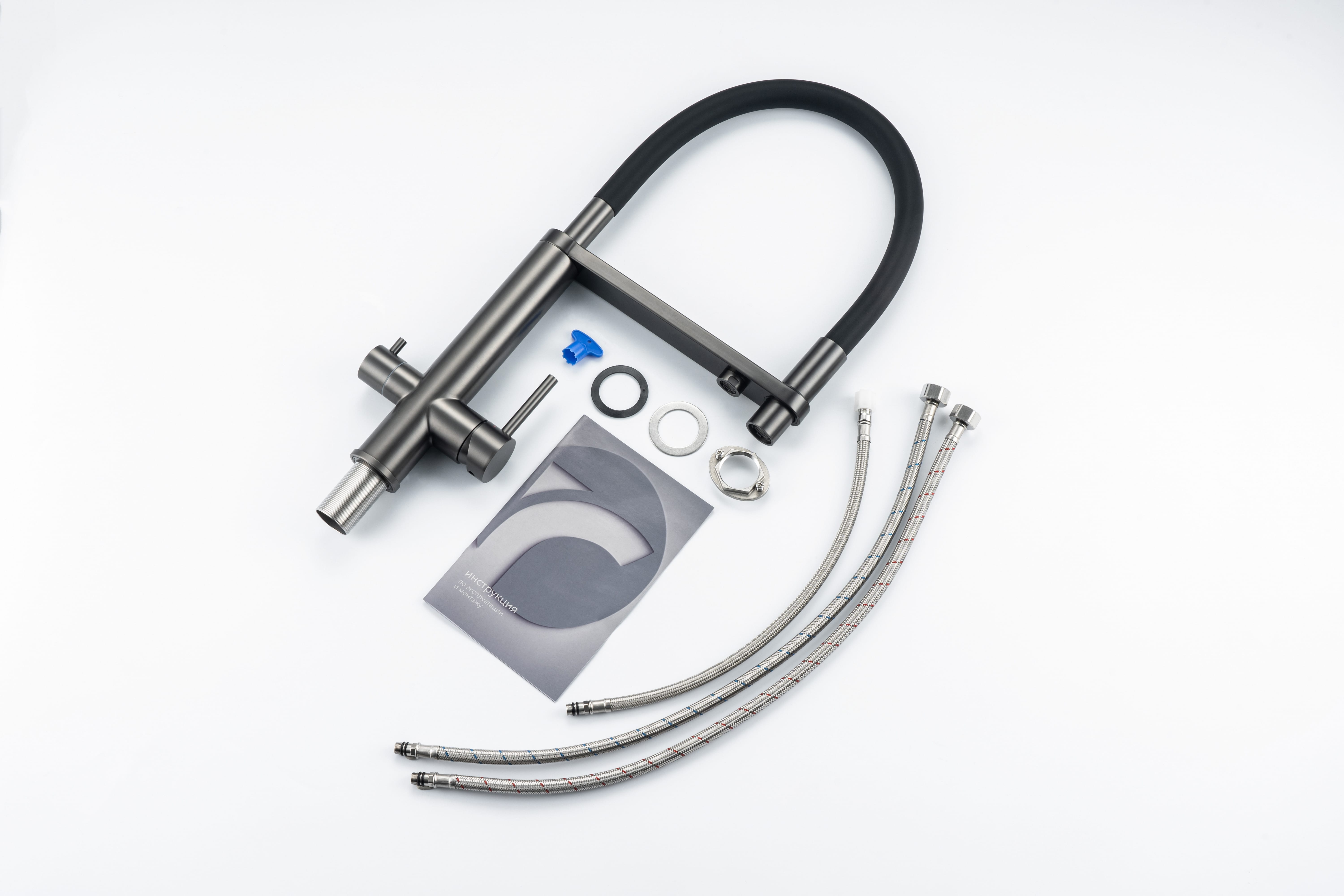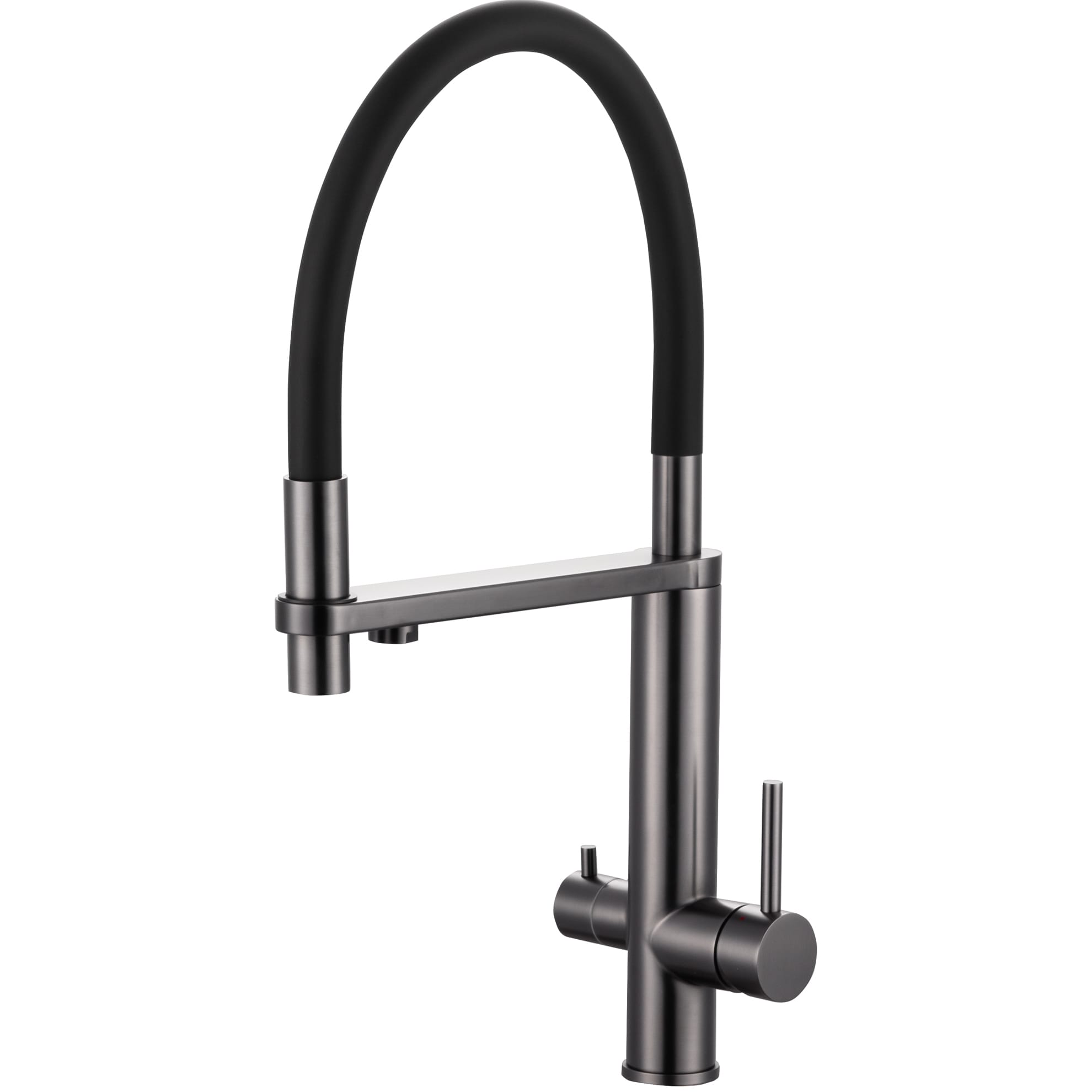 Смеситель для кухни/мойки Knotlor Infinity, с подключением к фильтру, однорычажный, поворотный, керамический, R-излив, гибкий, длина 237 мм, вороненая сталь/черный, нержавеющая сталь