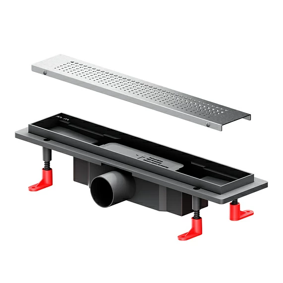 Оснащение Скребок для чистки трапа, решетка-фильтр, регулируемые опоры, корпус, решетка, комбинированный затвор с решеткой-фильтром, опоры, гидроизоляция, крючок, скребок