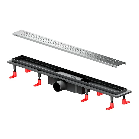 Оснащение Скребок для чистки трапа, решетка-фильтр, регулируемые опоры, корпус, решетка, комбинированный затвор с решеткой-фильтром, опоры, гидроизоляция, крючок, скребок