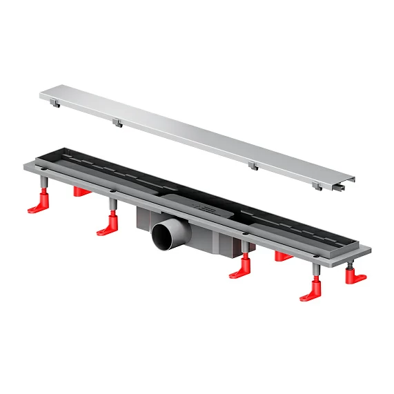 Оснащение Скребок для чистки трапа, решетка-фильтр, регулируемые опоры, корпус, решетка, комбинированный затвор с решеткой-фильтром, опоры, гидроизоляция, крючок, скребок